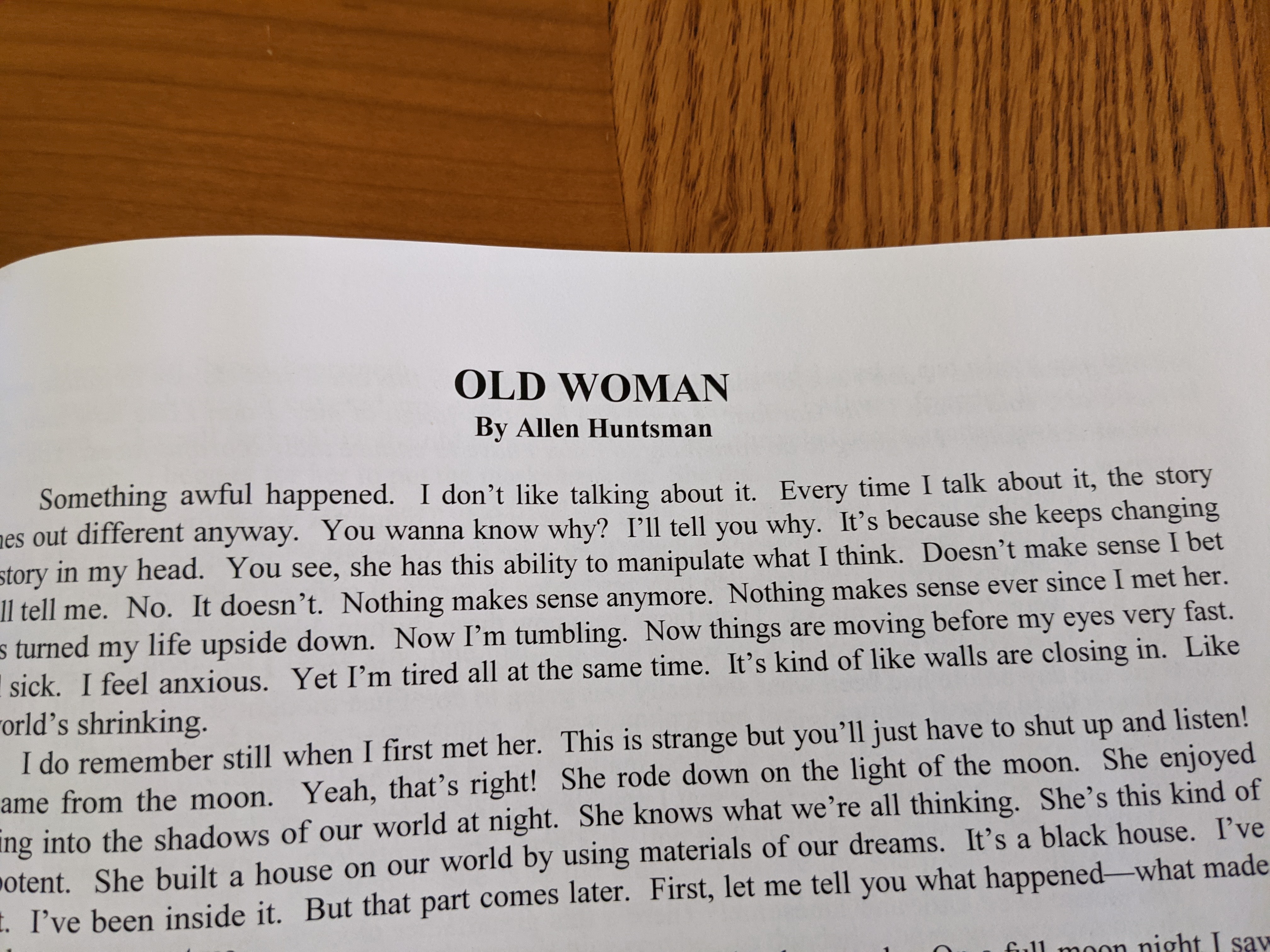 While I can’t claim that my first publication was the most magical time of my life, I definitely can say it was still very exciting. I had spent the past three years writing stories and submitting, piling up those rejection letters, the expected process every seasoned writer tells you about. “Old Woman” was my first publication, but it was not the first story I had written, nor was it the best. I had gotten lucky, I think, in finding a fledgling magazine and making the submission at the right time. I launched a dart in the dark and by good fortune hit the target, so to speak. Not that I want to put the story down, either. No, I like this story. I like the frenzied, dizzying imagery and the sense of paranoid drama developed in the first person narration.